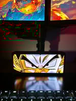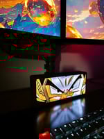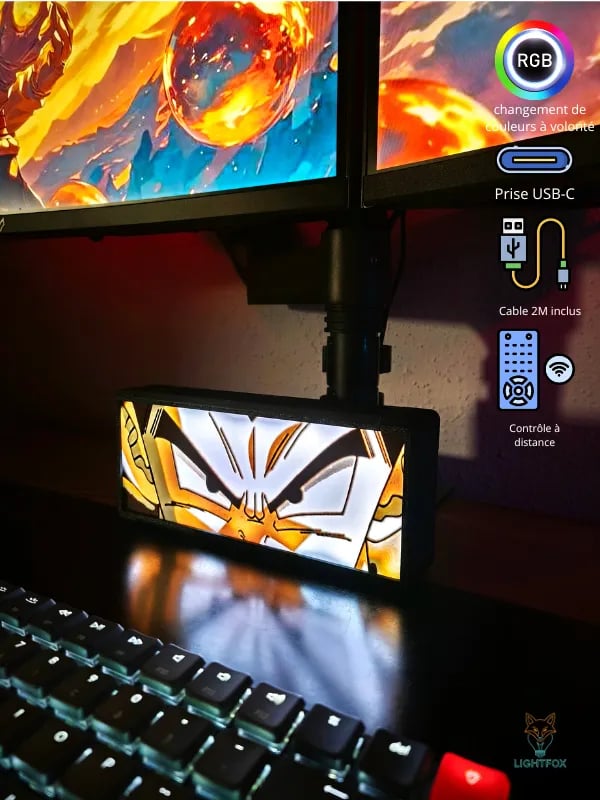 Illumine ton setup gaming avec cette lampe LED 3D Vegeta signée Lightfox, fabriquée à la main en Alsace. Imprimée en 3D avec du PLA haute qualité, elle diffuse un éclairage immersif inspiré du regard orgueilleux du Prince des Saiyans — parfaite pour une chambre gaming, un bureau ou un espace streamer fan de Dragon Ball.